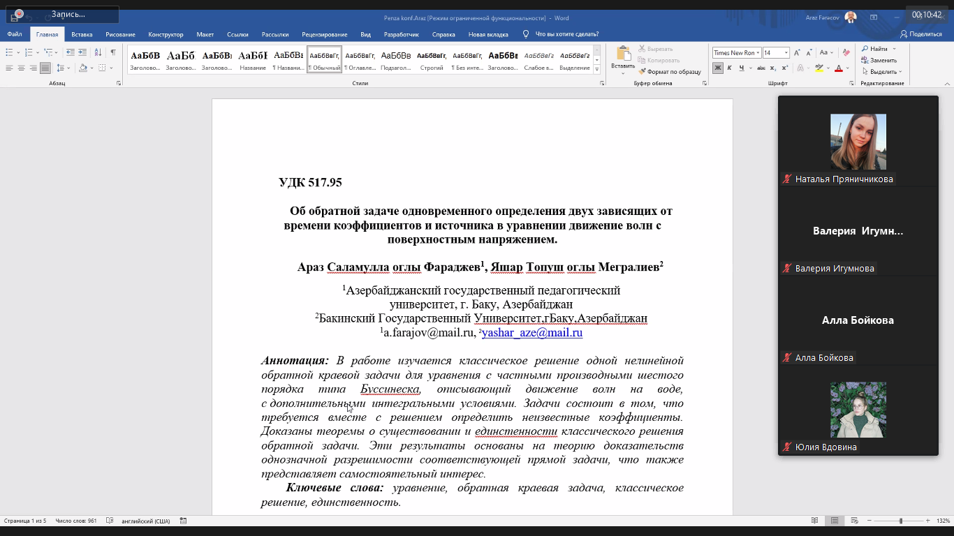 В работе конференции приняли участие ученые четырех стран: России, Азербайджана, Малайзии, Турции. Было сделано 6 пленарных доклада по современным разделам вычислительной математики и математического моделирования. В ходе работы секций был сделано 22 научных доклада, причем 4 работы поддержаны грантами Российского фонда фундаментальных исследований, 1 работа поддержана Университетом Малайзии Теренгану (Universiti Malaysia Terengganu, UMT) в рамках программы исследовательских грантов RMC. Количество очных участников – 37 человек; количество заочных участников – 53 человека.